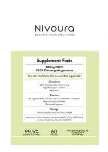 Our Nivoura NMN+ 500mg offers a 99.5% purity, encapsulated in 60 vegetarian capsules to elevate your energy levels and combat fatigue.